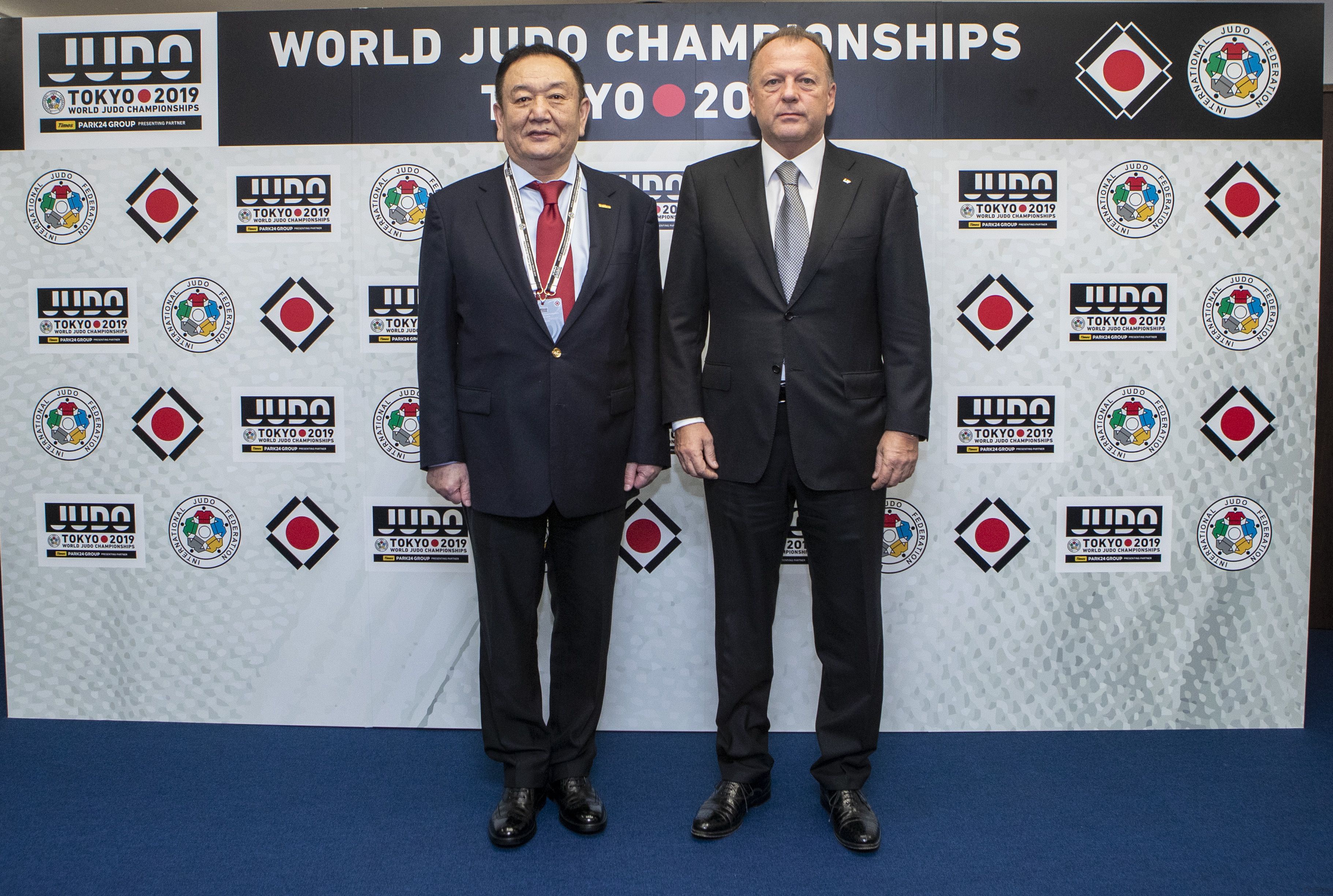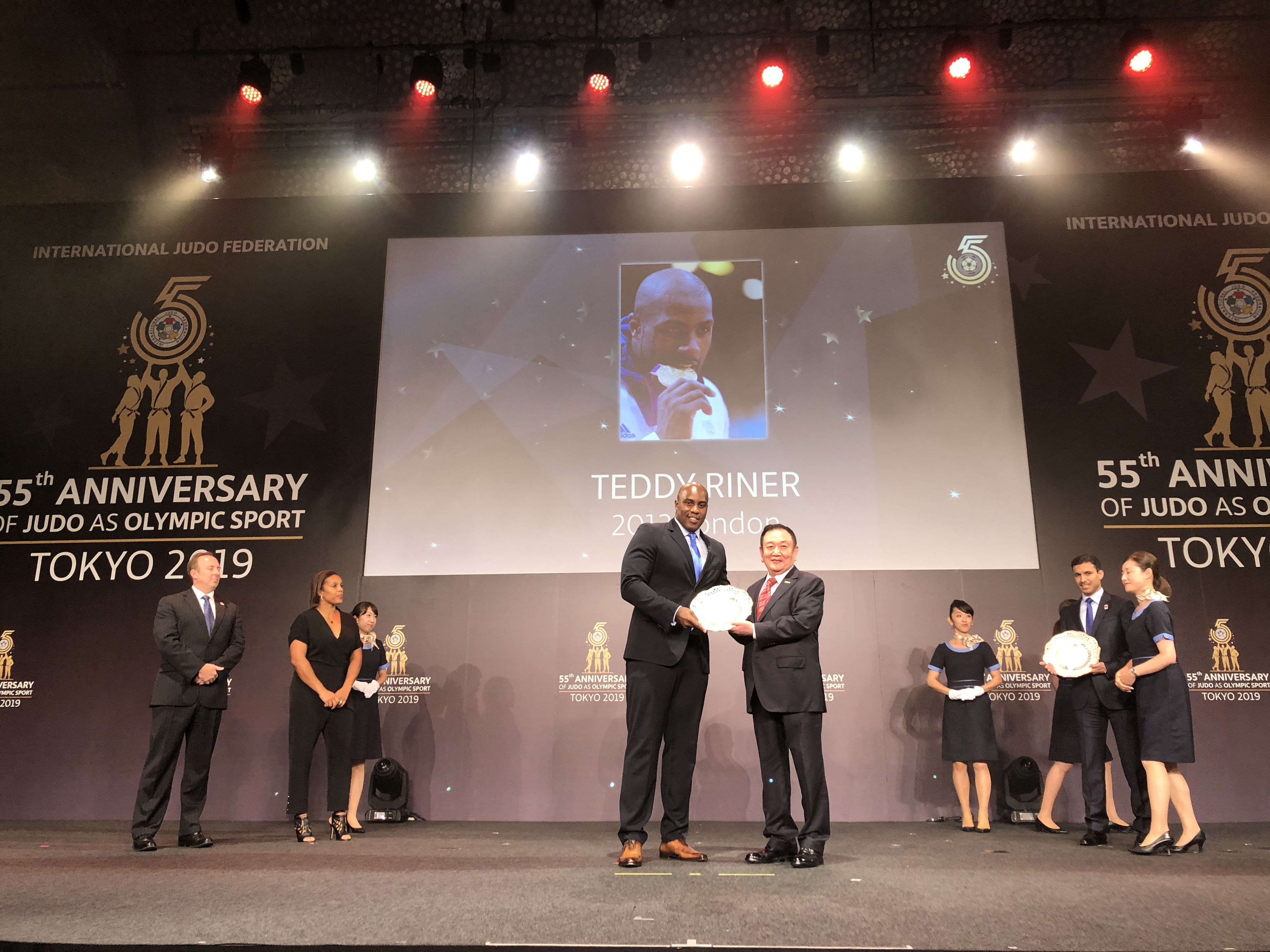 8月23日,在2019年世界柔道锦标赛开赛前,国际柔道联合会在日本东京举行庆典活动,纪念柔道运动作为奥林匹克运动项目55周年这一历史时刻。仪式上,国际柔道联合会将近60年来为世界柔道运动做出贡献的运动员与组织机构颁发奖项。泰山体育产业集团作为国际柔道联合会顶级合作伙伴受邀出席,董事长卞志良作为特邀嘉宾为伦敦奥运会最佳男运动员Mr. Teddy Riner,伦敦奥运会最佳女运动员Mrs. Lucie Decosse 颁奖。