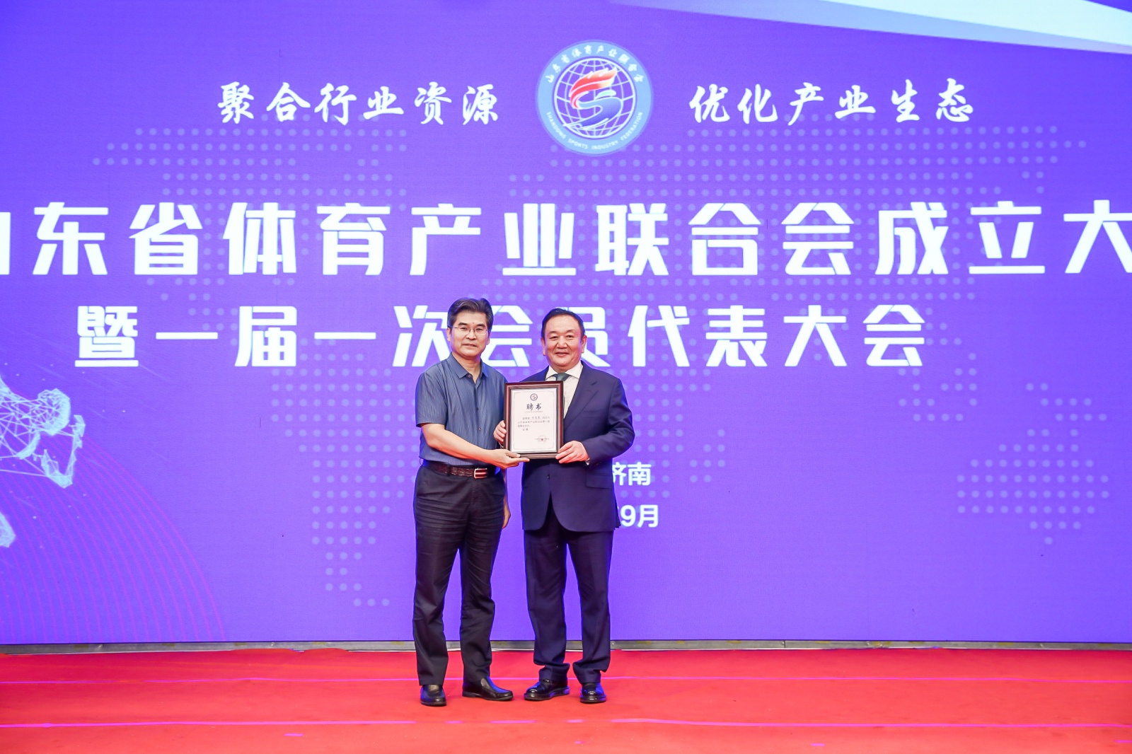 2020年9月16日,山东省体育产业联合会成立大会暨一届一次会员代表大会在山东济南隆重召开。中国体育用品业联合会主席李桦、山东省体育局副局长王延奎、中国文教体育用品协会副理事长张培生、中国体育用品业联合会副主席兼秘书长罗杰、山东省民政厅社会组织管理局二级调研员王军、山东省体育总会秘书处处长孙照亮、山东省体育局经济处处长徐金龙、山东省体育产业发展服务中心主任翟培建出席。山东省体育产业联合会近200名会员单位代表以及部分省市媒体共同参加。全国政协委员、泰山体育产业集团董事长卞志良当选首届理事会会长并发表讲话。
