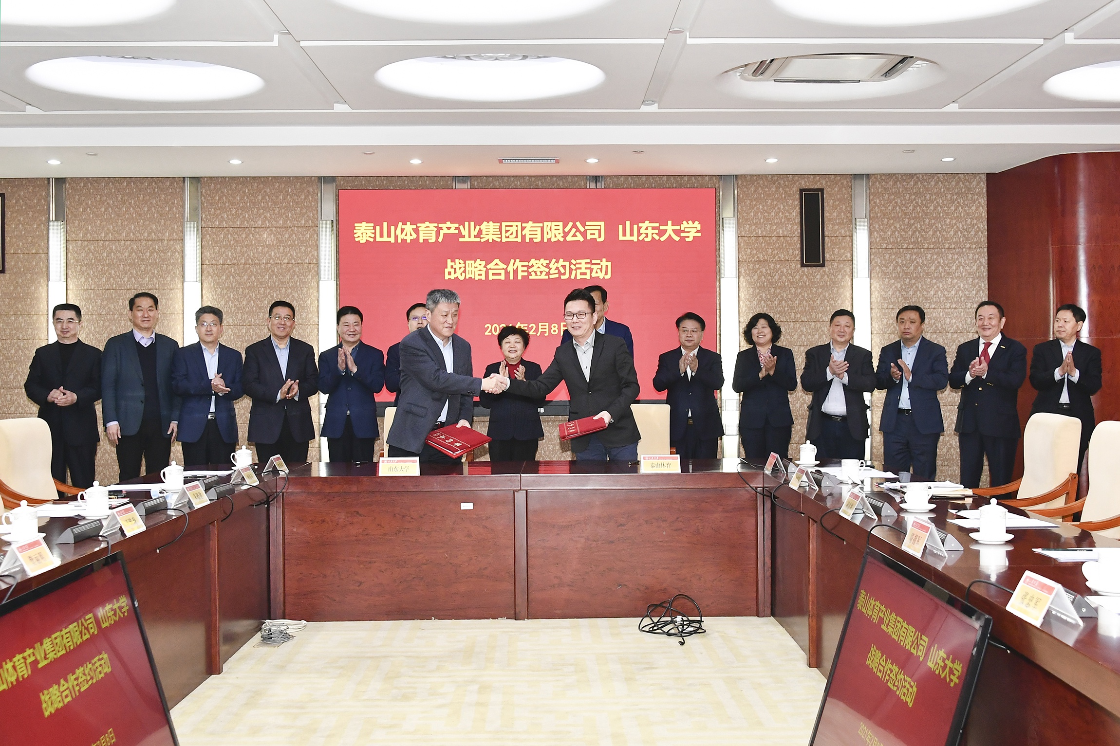 为积极建设“体育强国”、“健康中国”、“健康山东”,努力实现产教融合与产学研深入合作,2021年2月8日,泰山体育产业集团与山东大学战略合作签约仪式在山东大学中心校区隆重举行。山东省体育局党组成员、省体育总会专职常务副主席隋拥军,山东省工信厅二级巡视员张忠军,山东省科技厅总工程师孙高祚,省体育局体育产业发展服务中心主任翟培建,山东省科技厅张大瑞,德州市副市长马俊昀,乐陵市委副书记、市长陈光春,山东大学党委副书记、校长樊丽明,全国政协委员、泰山体育产业集团有限公司董事长卞志良等领导出席仪式。签约仪式由山东大学党委副书记王君松主持。