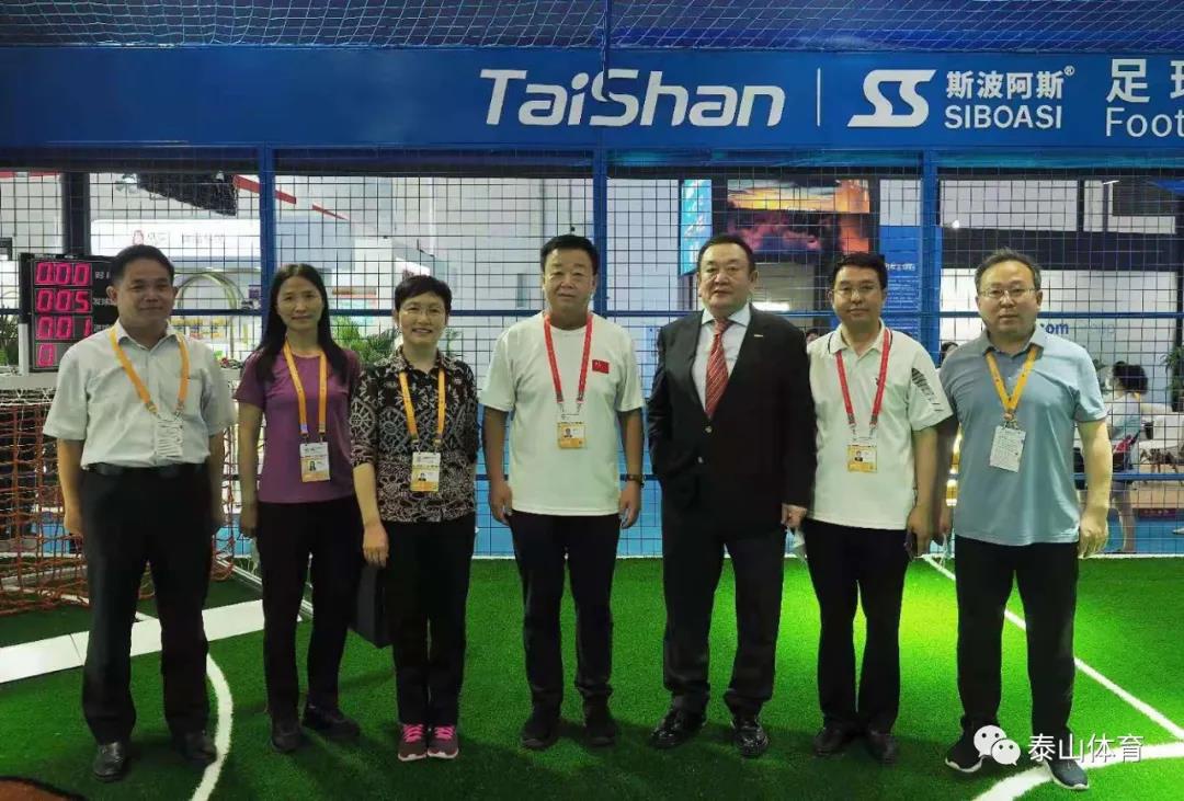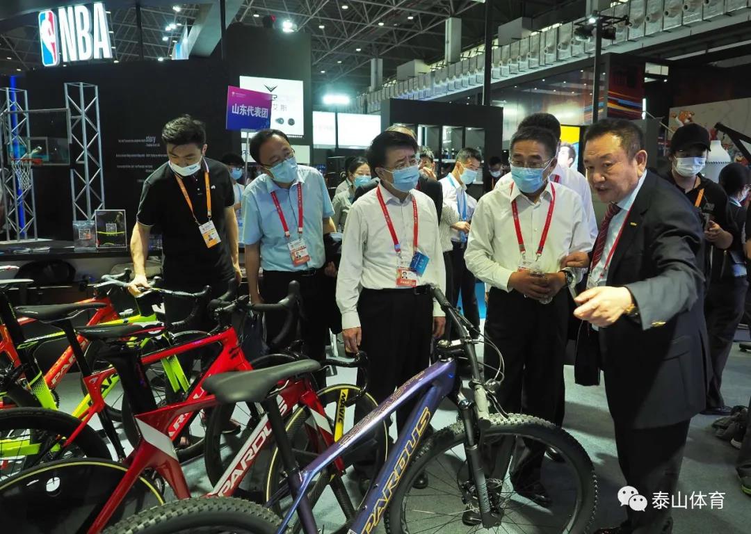 山东省商务厅厅长张德平在泰山体育产业集团董事长卞志良陪同下参观一号馆泰山体育展厅。
