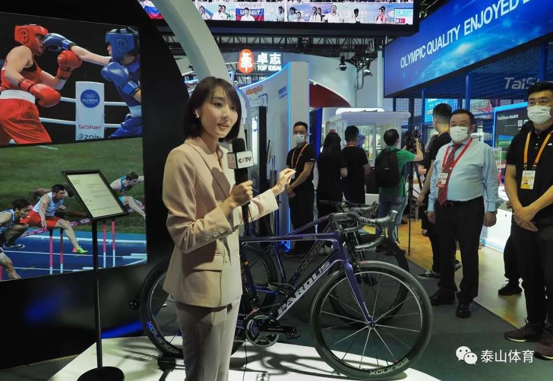 央视新闻频道消博会专题现场直播来到泰山体育展厅,央视新闻记者宋菀在泰山瑞豹运动自行车展位单手感受泰山瑞豹碳纤维自行车的轻量化高刚性的“黑科技”高性能,圈粉无数。