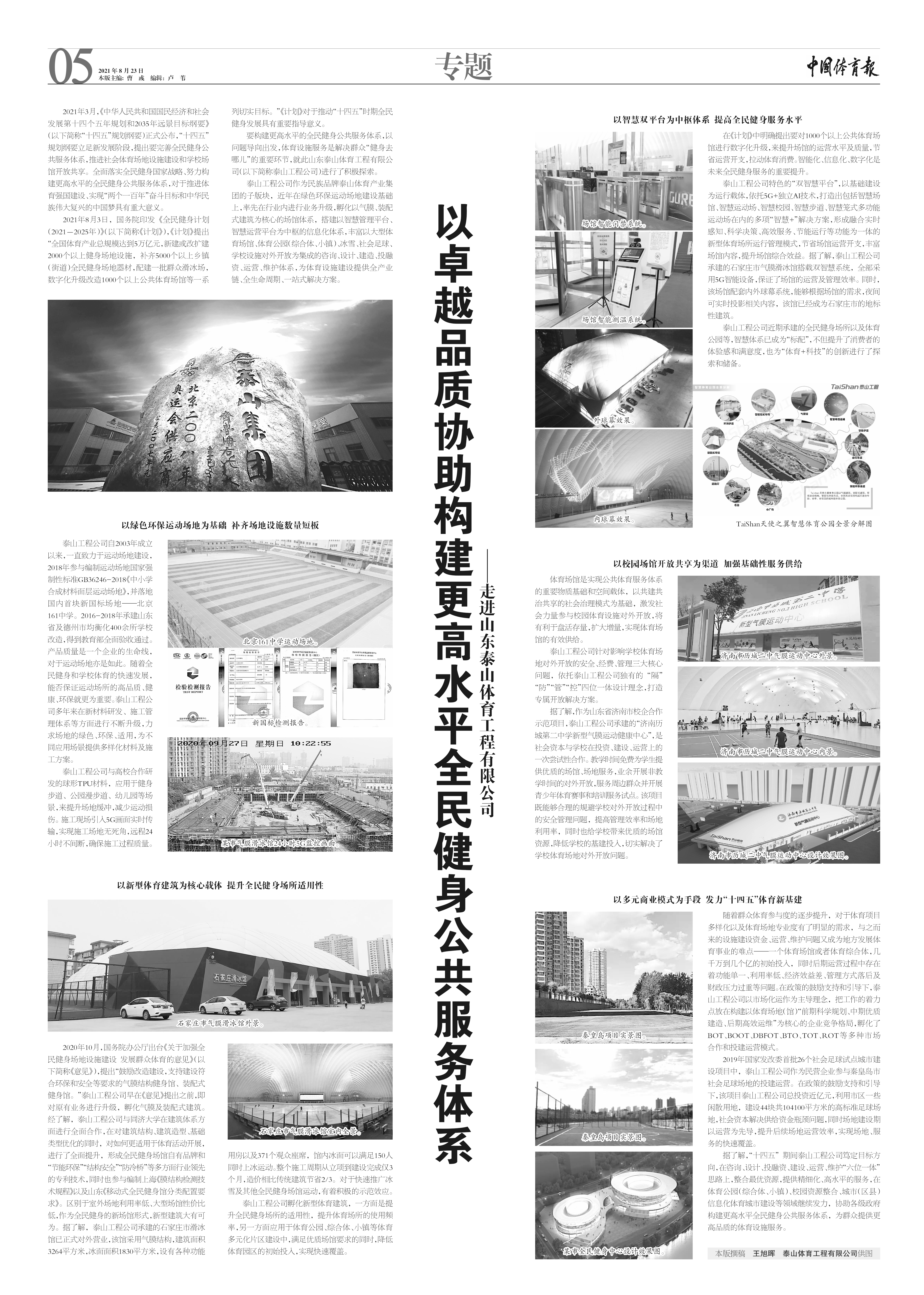 2021年8月23日,《中国体育报》整版刊载《以卓越品质协助构建更高水平全民健身公共服务体系——走进山东泰山体育工程有限公司》。