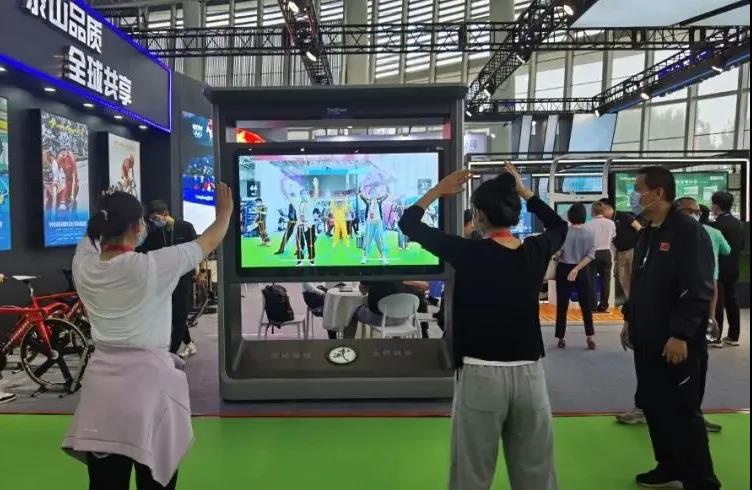 针对全民健身,泰山体育带来了“智能健身驿站”、“AI 武术大屏”等智能产品。凭借“高颜值”、“趣体验”,“武术大屏”前聚集了现场热情的观众一展身手,“切磋武艺”。“泰山体育AI 武术大屏”是一款应用 AR 增强现实技术与人工智能技术相结合来重构传统武术动作体验的智能应用产品,通过人工智能 AI 大屏结合肢体 识别与肢体捕捉算法,将专业武术老师的武术动作进行数字化展示,引导大众参与武术动作教习体验,并对体验者给出相应动作的正确反馈,更有打分竞技比赛趣味,是一款可娱乐可教习的智能武术互动系统。