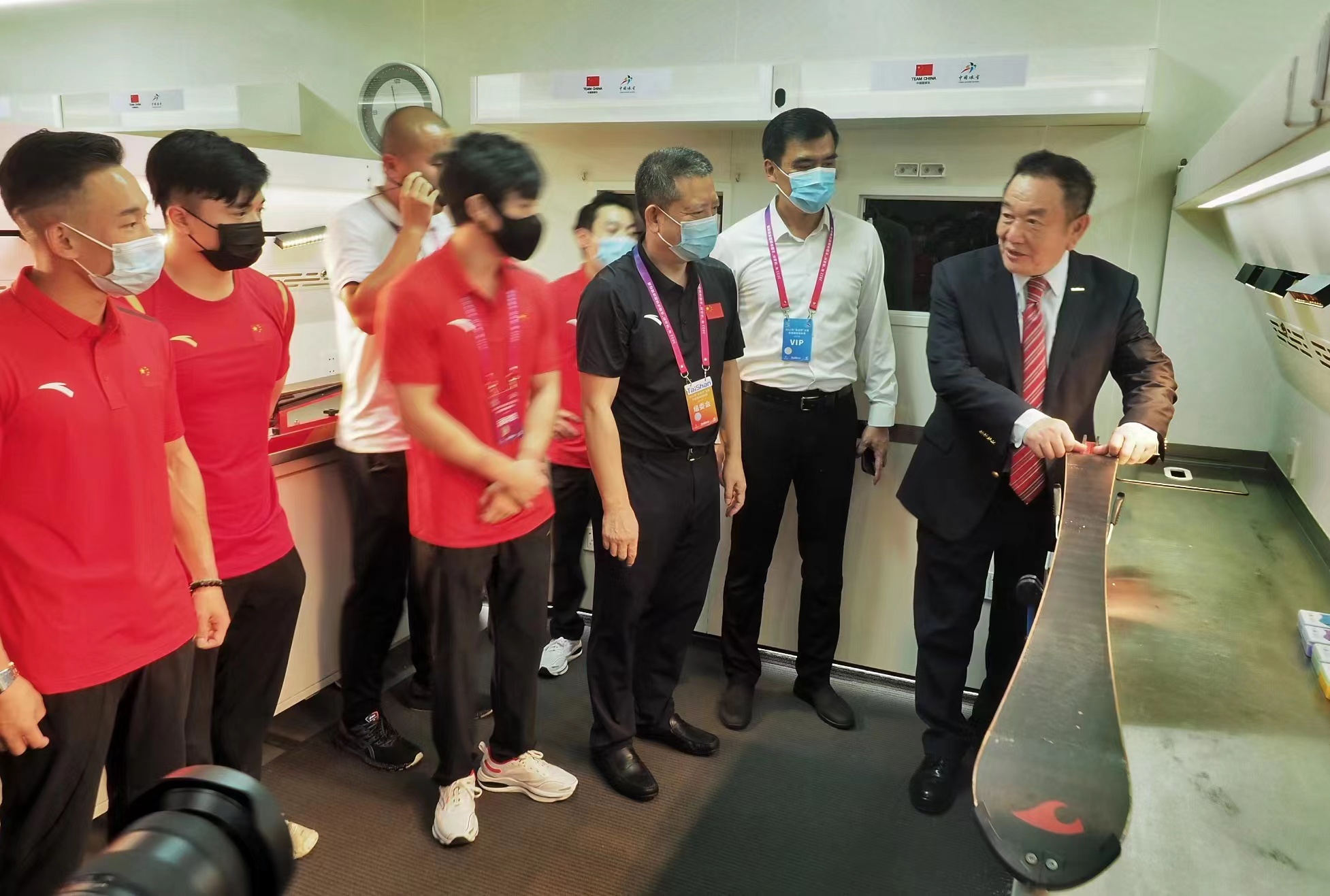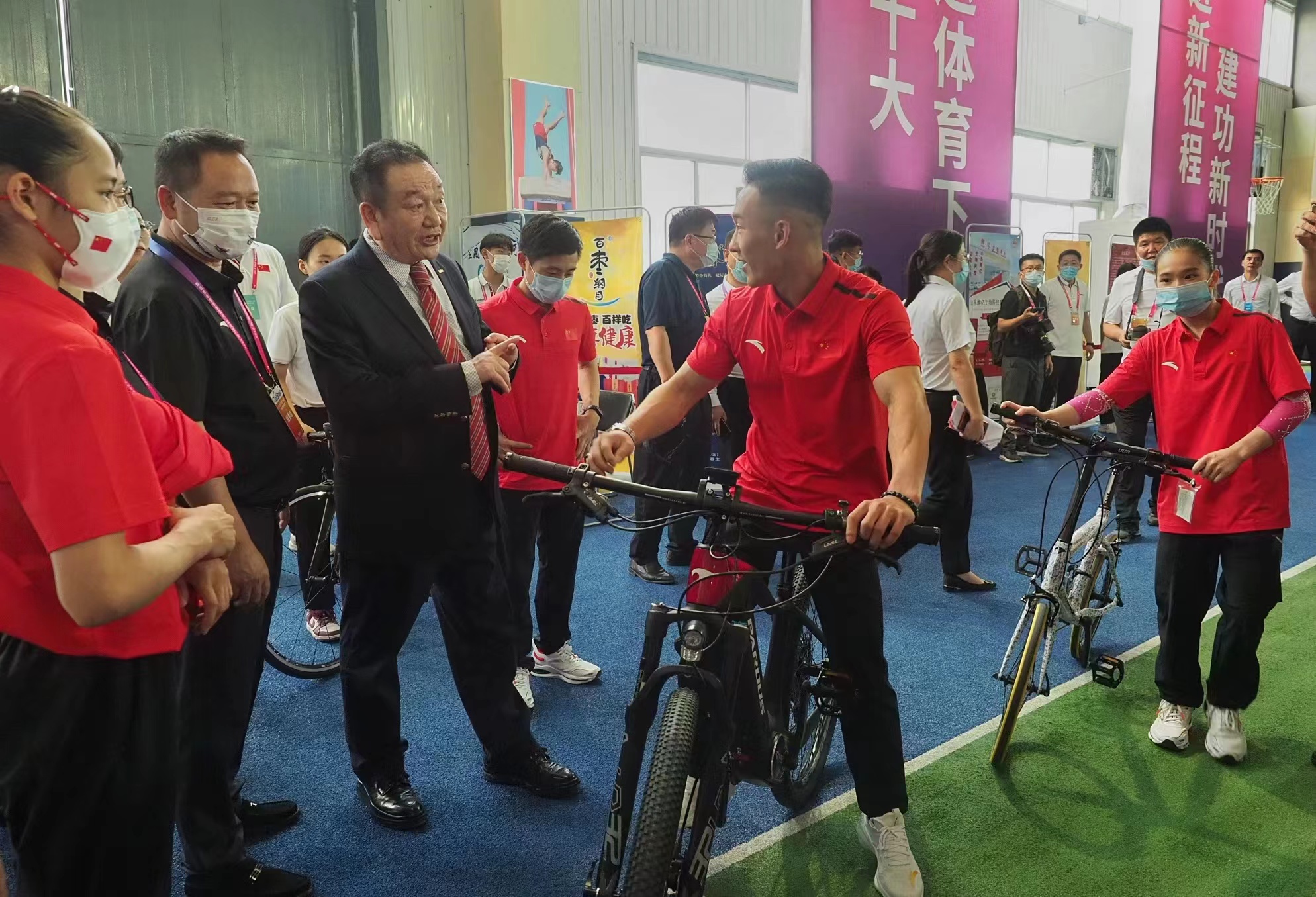 泰山瑞豹碳纤维自行车就是泰山体育立足科技创新、制定国际国内标准的代表产品。步入博物馆体验馆区,一排闪耀着科技感、未来感的自行车吸引了众人的目光。泰山瑞豹是中国国家自行车队(公路、场地中长组)、中国国家铁人三项队器材供应商,2016年里约奥运会上成为首个登上奥运会自行车项目舞台的首个自主品牌,打破了欧美国家在这一领域的百年垄断。产品曾荣获“中国优秀工业设计金奖”、IF国际设计大奖等。运动员们亲自上阵,体验自行车的高性能。