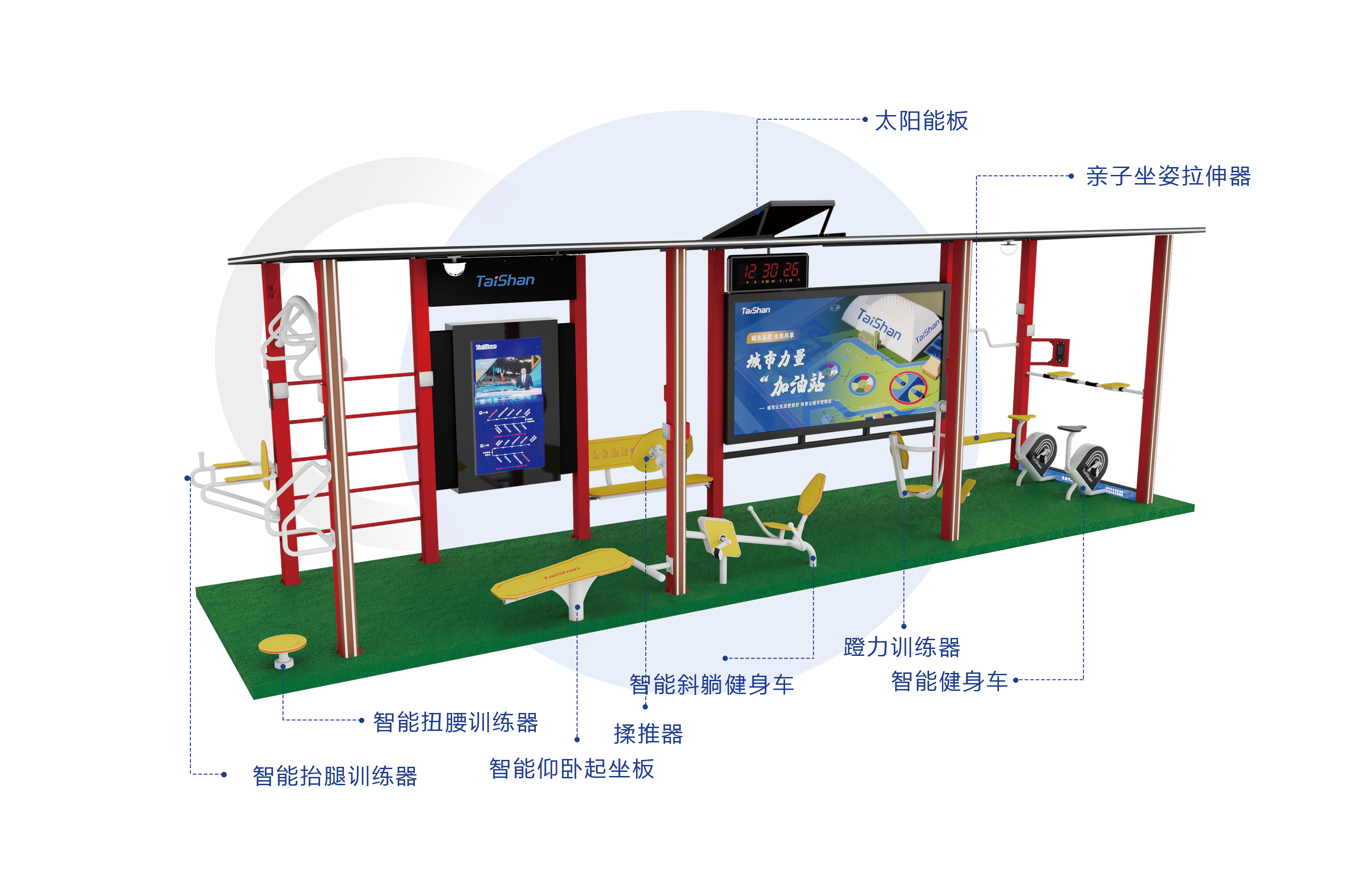 综合健身公交站是由泰山体育完全自主研发设计,适用于城市公交候车区域的“城市力量加油站”。综合健身公交站配备多种健身项目,能够根据城市需要设计不同健身项目与功能的移动室外健身驿站。依托物联网+互联网和5G技术,能够充分发挥城市运动新型体育服务综合职能,为运动人群提供更多科学健身指导,为城市居民打造更健康的生活方式。公交候车亭在城市的广泛使用,为乘客在侯车时提供躲避日晒雨淋的短暂场所,随着城市的发展以及科技的进步候车环境大为改观,综合健身公交站已经成为城市一道靓丽的风景,多功能化、智能化候车亭将缓解候车时的焦虑情绪,改善人们出行的愉悦心情更是提高社会和谐的有效手段。