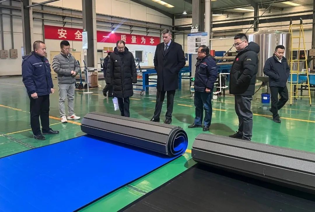 卡洛斯·艾力克主席深入泰山体育的产品中心与生产线,见证了智能化制造的全流程。在参观中高度评价泰山体育的创新能力和产品质量:“泰山体育不仅是器材供应商,更是国际柔道标准制定的重要参与者。”